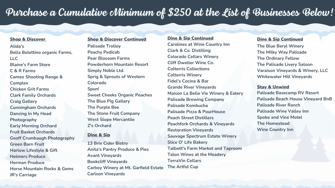 Please read the information below to learn more about the program and the rules. Thank you for supporting our local small businesses that make Palisade unique!